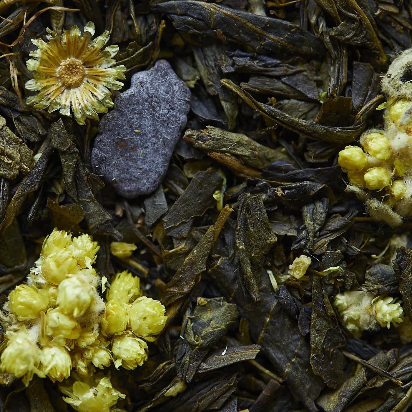 Ajerkoniak, zielona herbata z kawałkami czekolady, płatkami kwiatów, posypką o smaku kokosa i rumu. Intensywny, otulający nutami słodkimi i likierowymi.